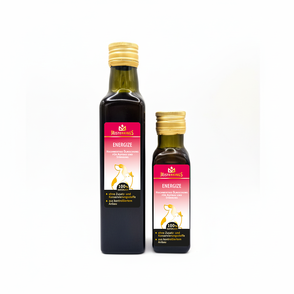Unsere hochwertige Ölmischung eignet sich zur Rekonvaleszenz und als natürlicher Energiespender. Das enthaltene Reiskeimöl liefert hochwertige und leicht verdauliche Proteine, die die Muskulatur stärken und so die Regeneration unterstützen. Dies ist besonders im Senior-Alter wichtig und gibt zusätzliche Energie. Lachsöl ist reich an Omega-3-Fettsäuren, die entzündungshemmend wirken und das Herz-Kreislauf-System unterstützen können. Hanföl enthält unter anderem Omega-6-Fettsäuren, welche für die Gesundheit von Haut und Fell wichtig sind. Eine Kombination dieser Öle kann also eine Vielzahl von gesundheitlichen Vorteilen bieten.